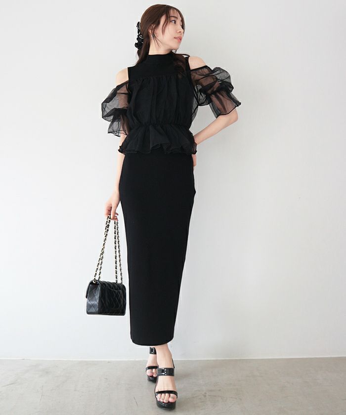 ふんわりと柔らかなチュールを重ね、ギャザーをあしらうことでボリュームを持たせたシルエットは、シアー感を活かして軽やかな印象に。