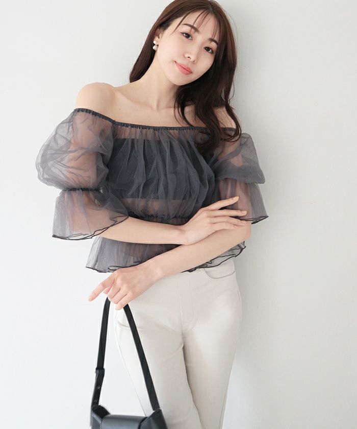 商品情報 軽やかな甘さを楽しむオフショルダートップス。