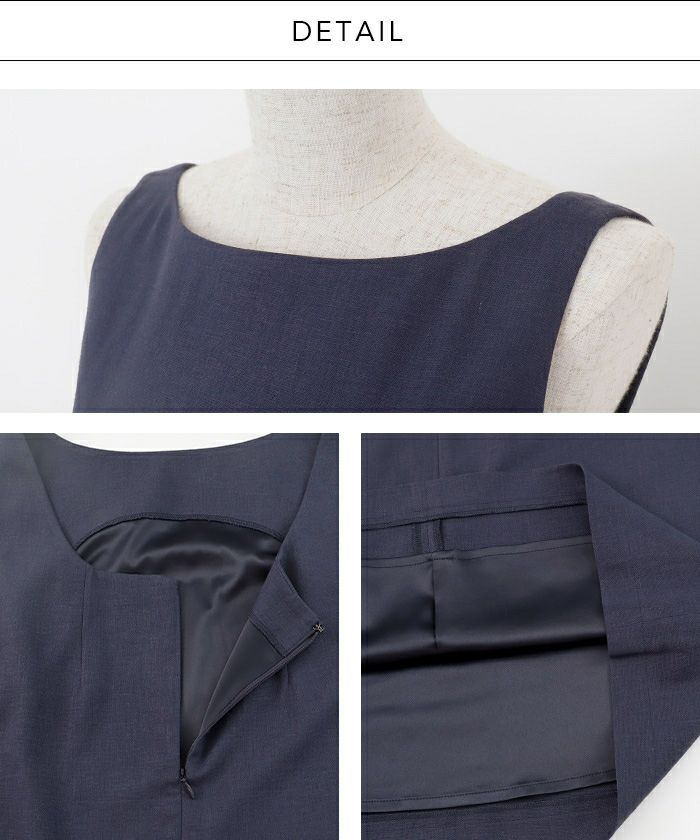 鎖骨が隠れる浅めのボートネックとやや華奢な肩幅、ボディラインを拾い過ぎないAラインシルエットと1cm単位で計算された2サイズ展開の着丈は、潔く見せる事で脚線美を演出。