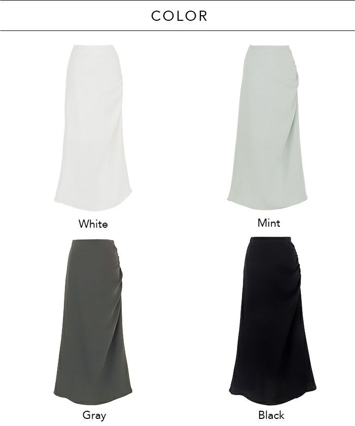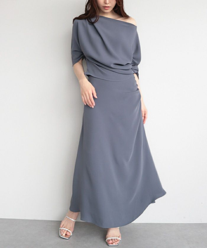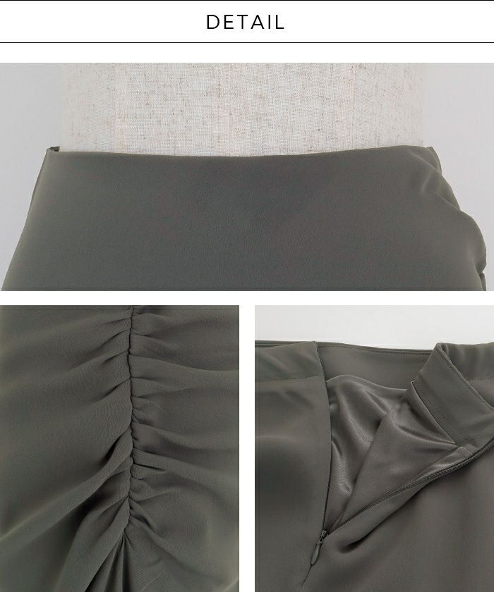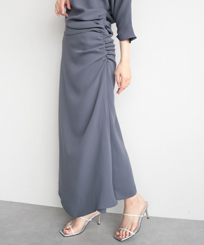 同素材のドルマンタックトップスと合わせると、サイドのギャザーデザインがトップスから繋がるようなセットアップとなりスタイルアップが叶います。