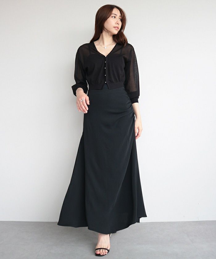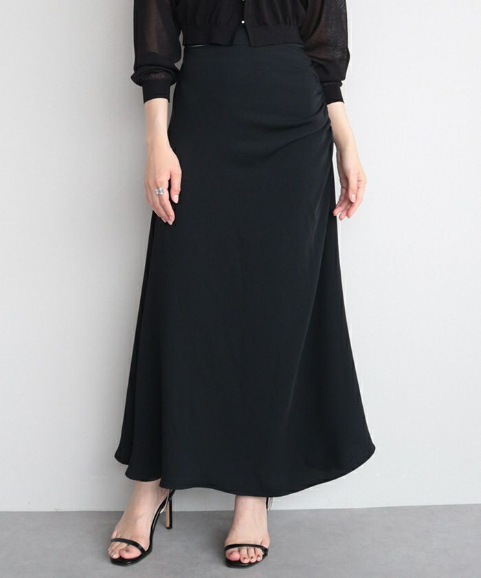 落ち感ある生地の特性を生かした左脇のギャザー使いが、しなやかなドレープを生み出すので裾周りにかけて優雅な動きを表現します。