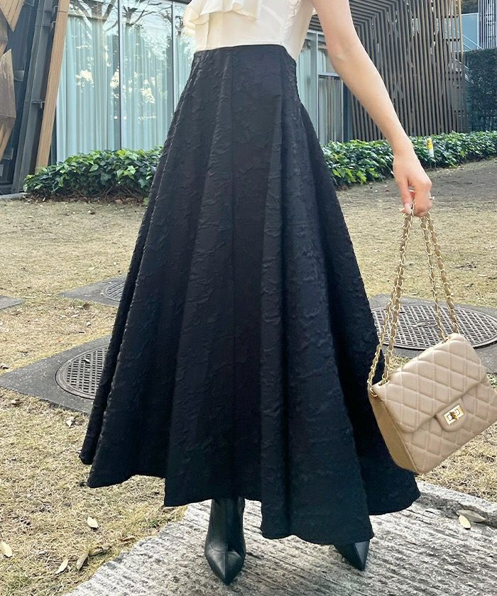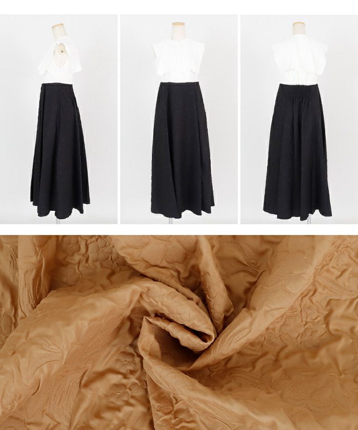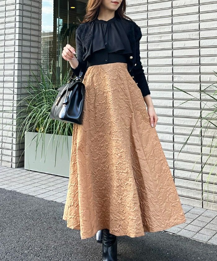 柔らかなトップス部分とハリのあるジャガード生地でフワッと広がるスカートが華やかな印象に。