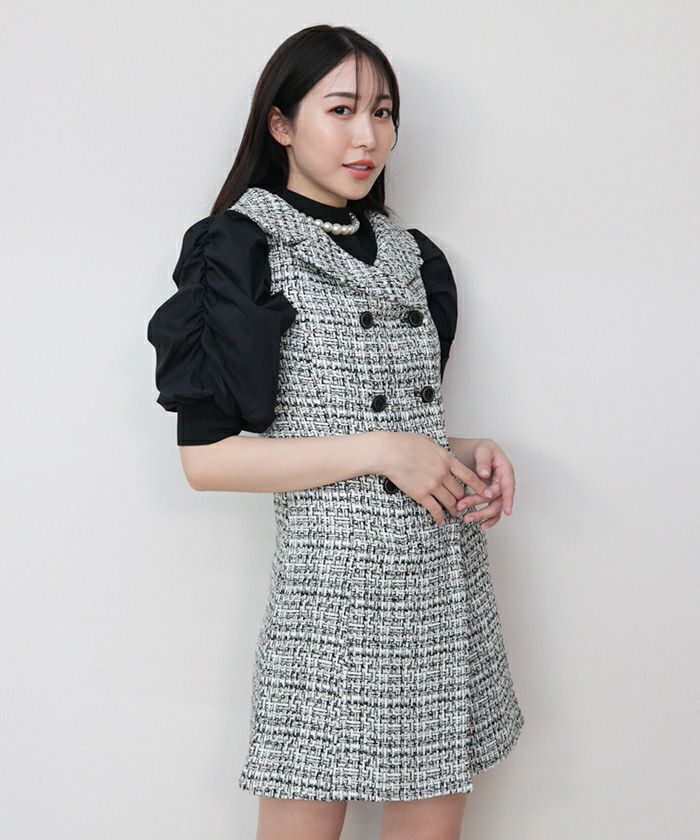 ジャケットライクなデザインでラグジュアリーなオーラを放つジレワンピース。