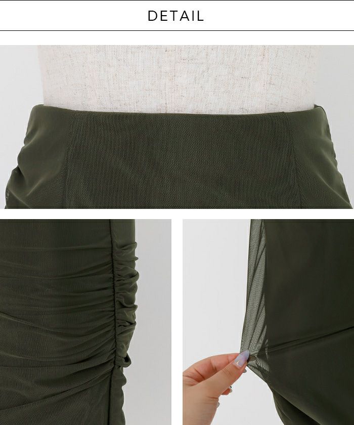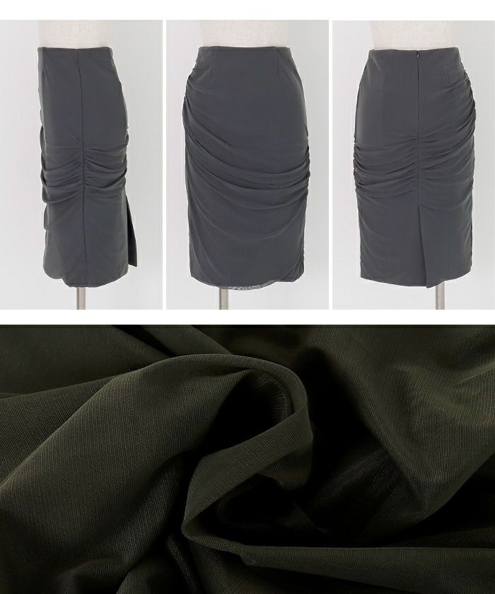 両サイドとヒップの中心にギャザーを施したことで美しい艶とドレープを生み、女性らしさを演出しながら腰回りの骨感やボディラインをカモフラージュする効果も併せ持つデザイン。