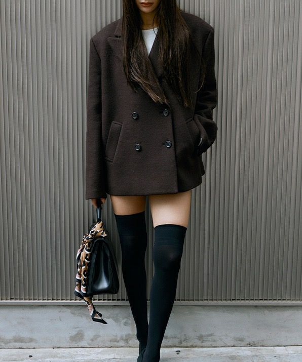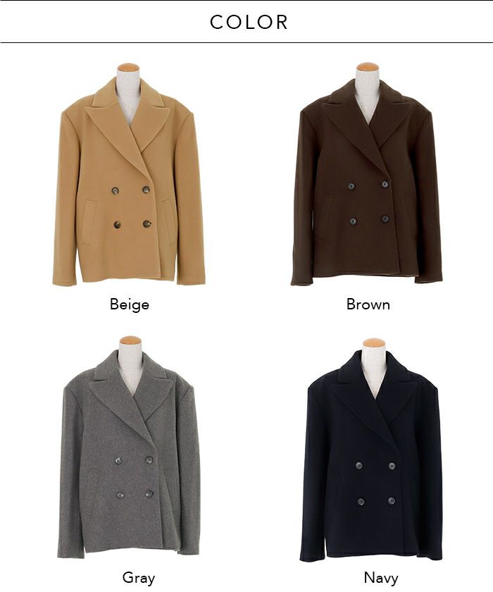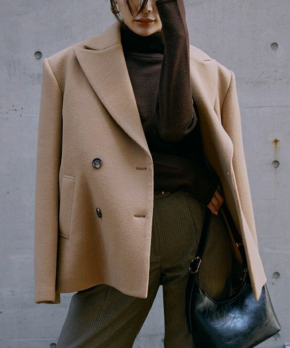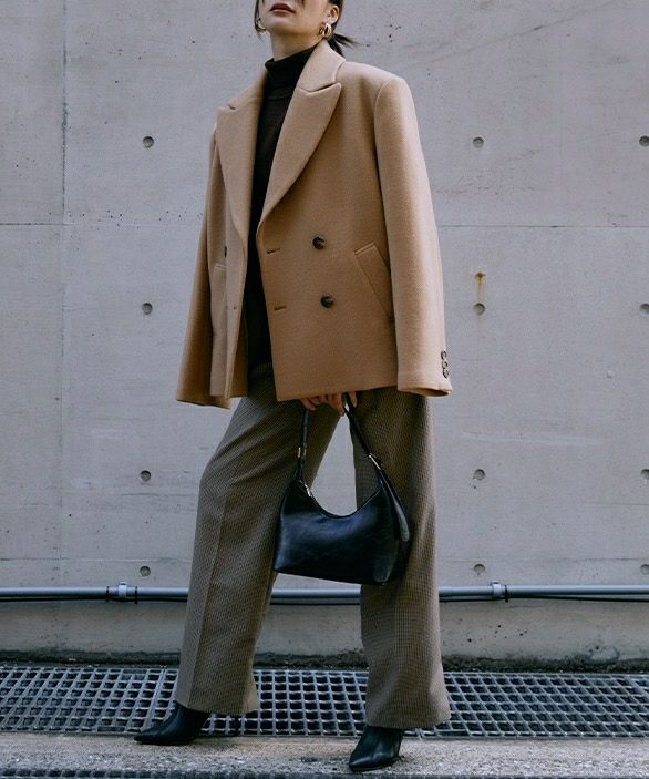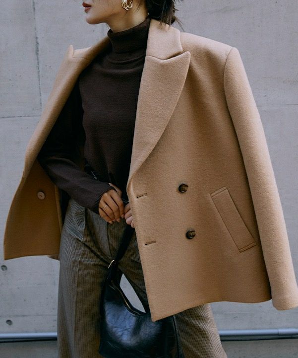 大きめなピークドラペル、ダブルブレストのデザインに程よいオーバーサイズ、ショルダーパッド入りでソリッド且つ端正なバランスで、スタンダードなのに旬な女性らしさを表現し、羽織るだけでどんなスタイリングも垢抜けた雰囲気を演出します。
