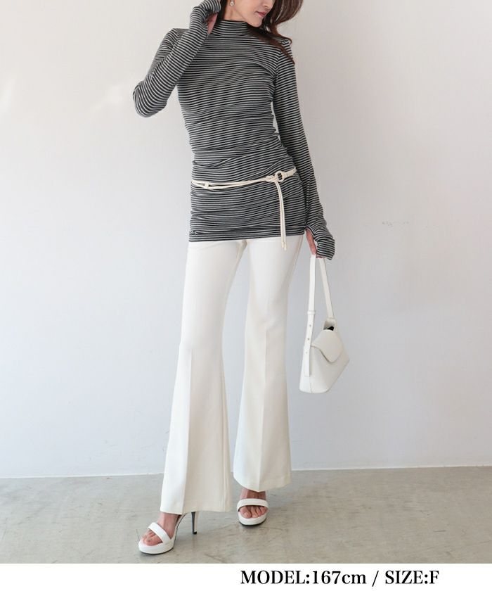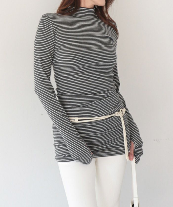 シンプルデザインと華奢なボーダー柄がスタイリングの要になるアイテム。