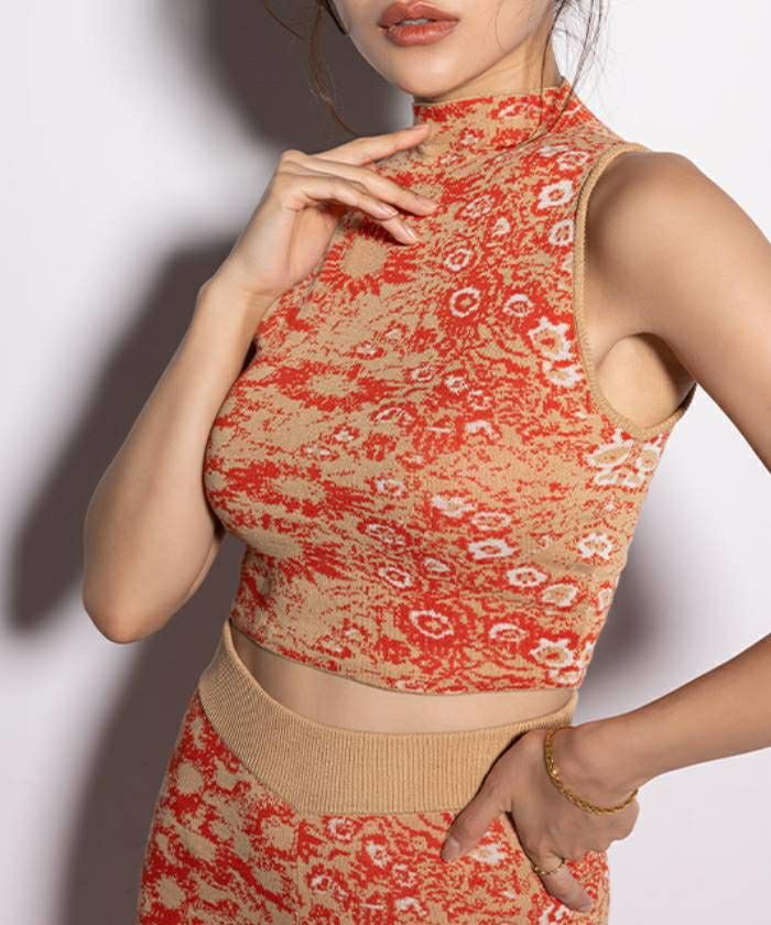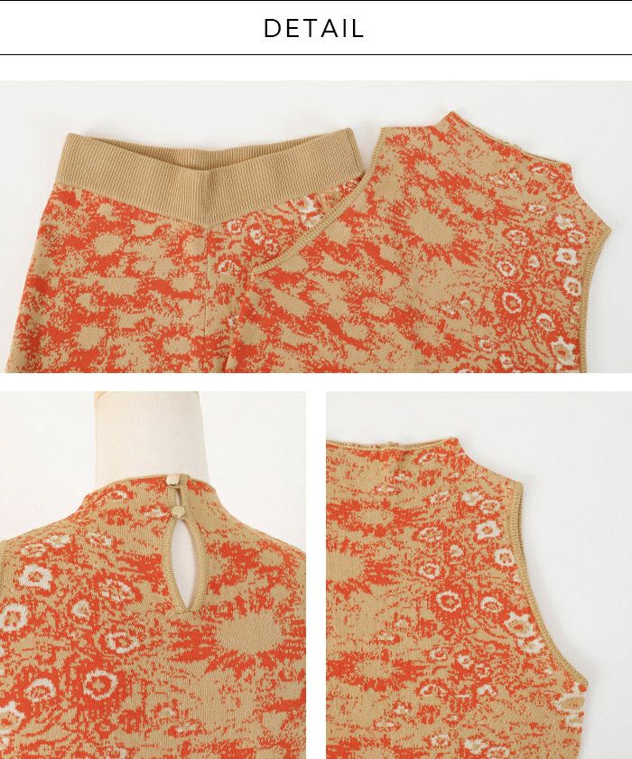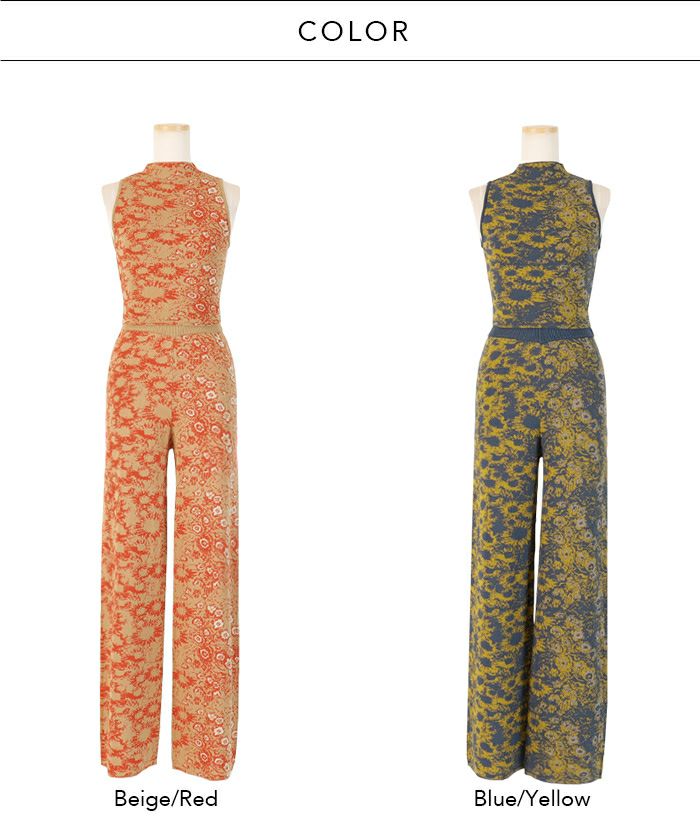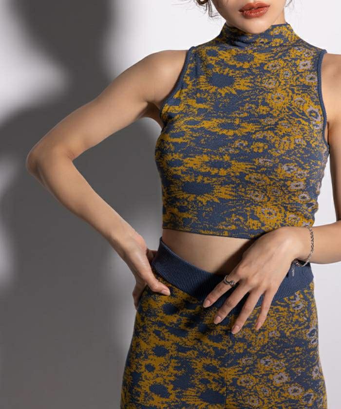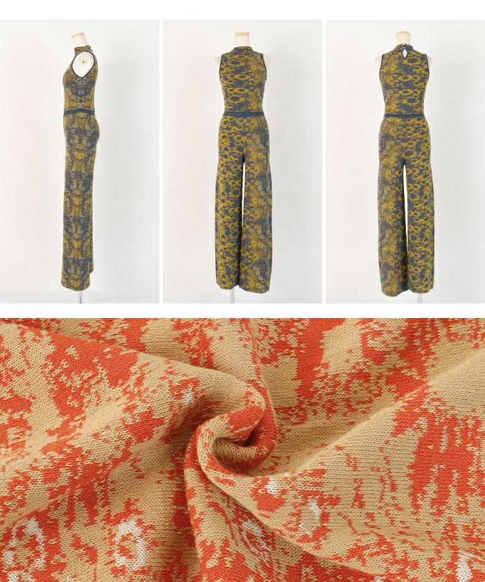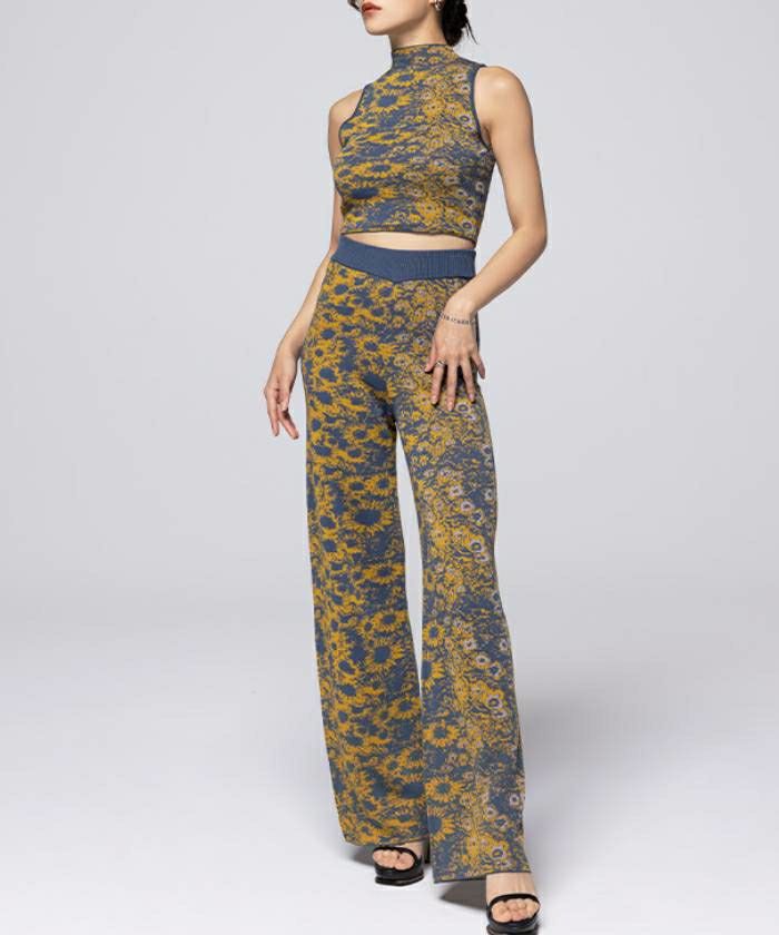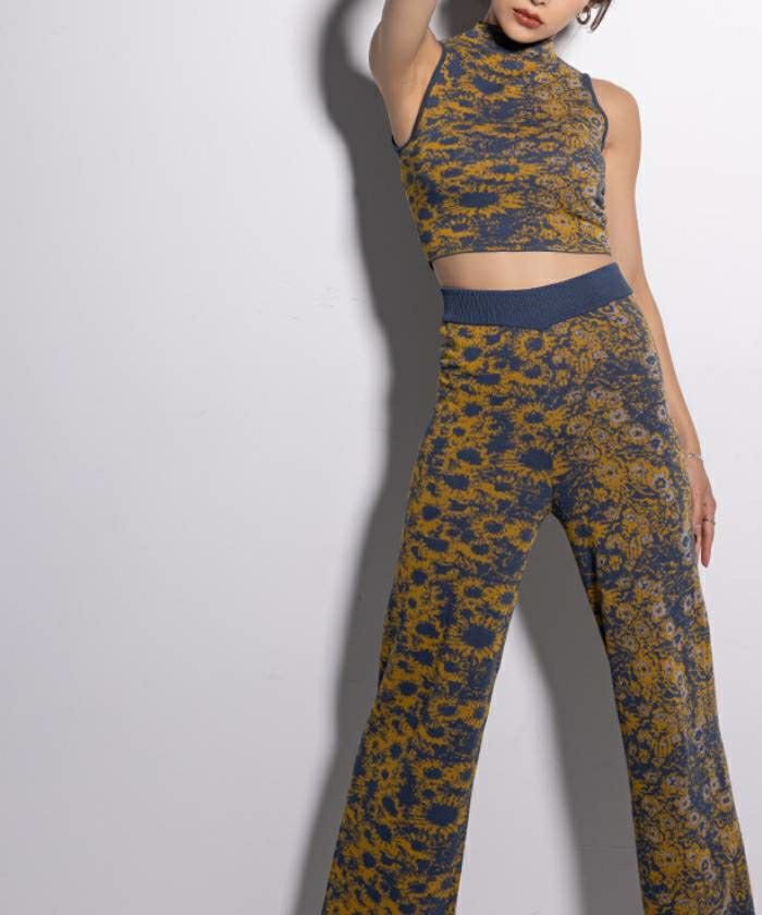 視線をさらうほど大胆な色柄を楽しめるニットセットアップ。