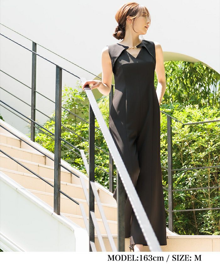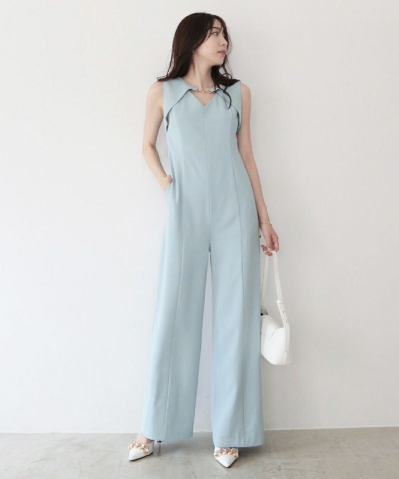 人気の高い綺麗めオールインワンは、キラリと光るビットパーツをアクセントに施した目新しい一枚。
