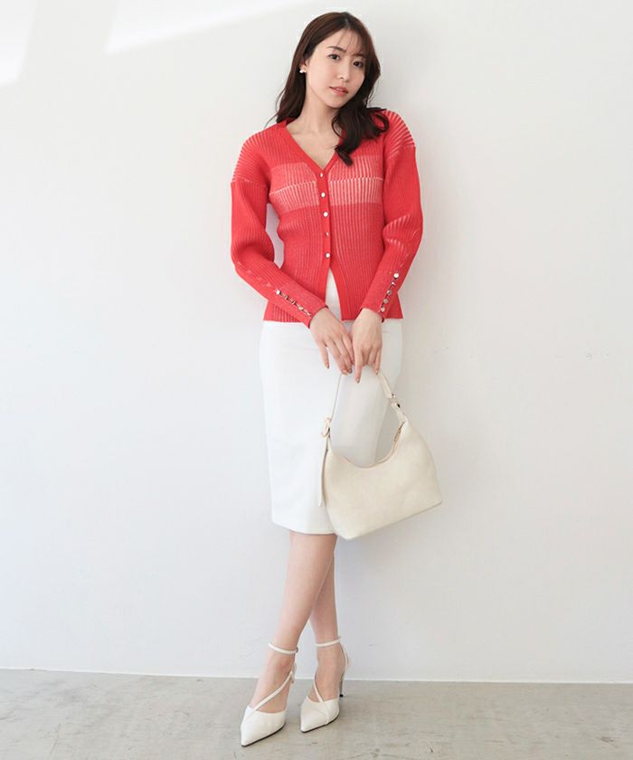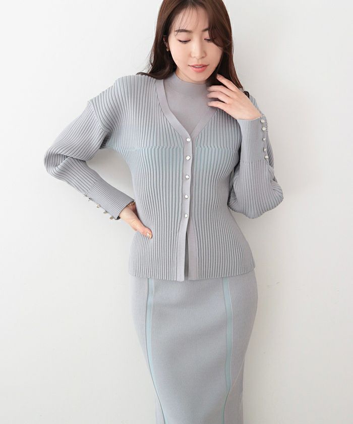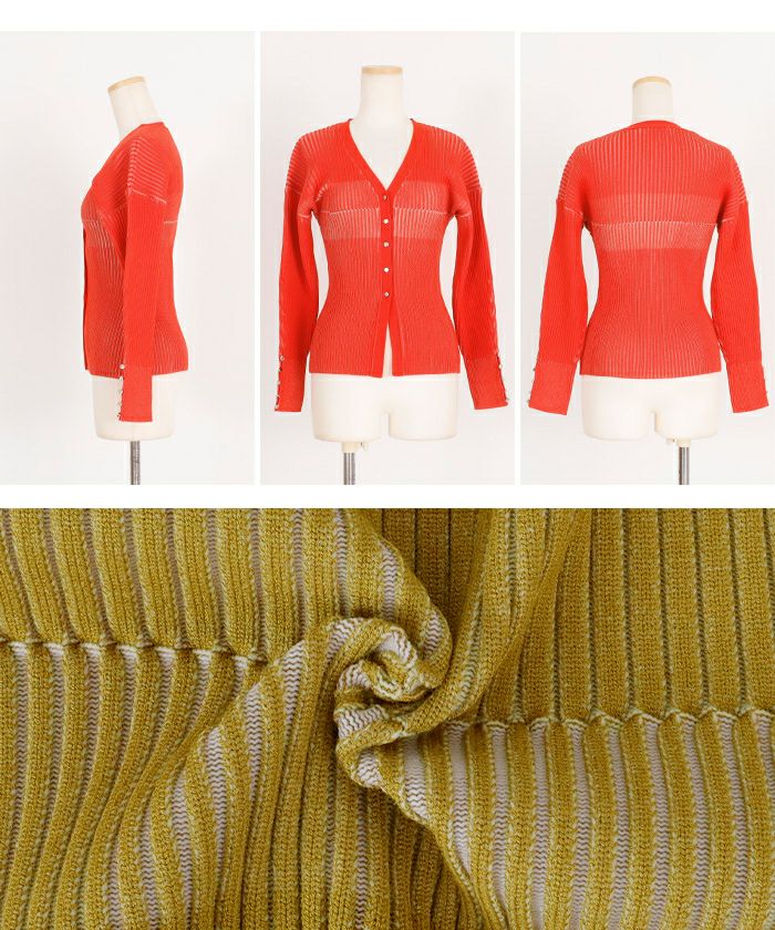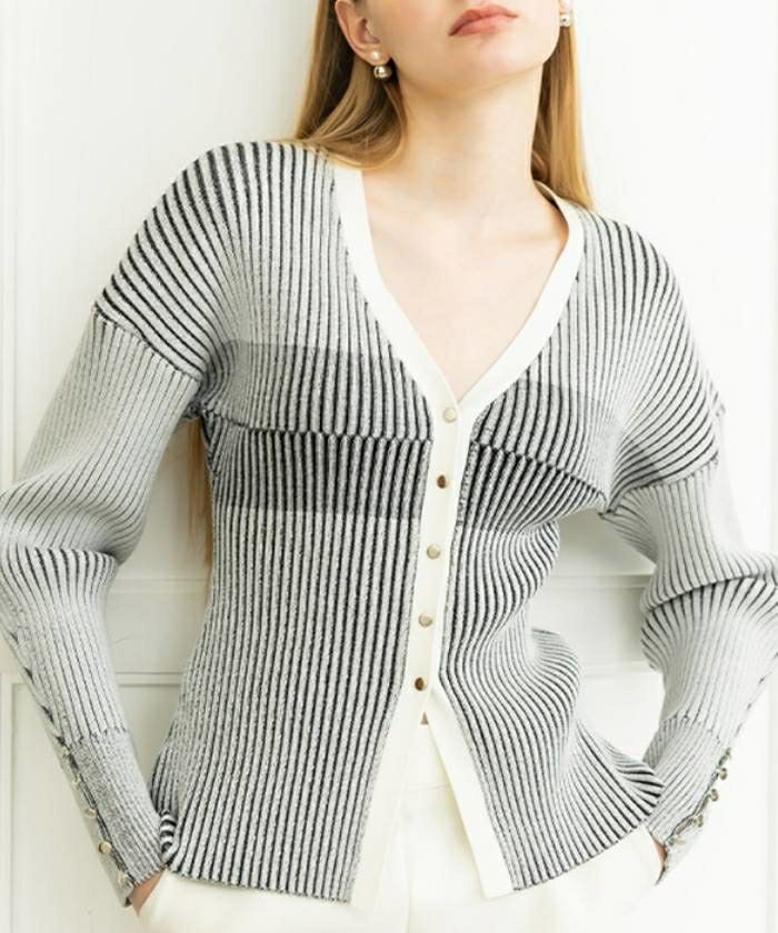 リブの凹凸でコントラストカラーが表現されたデザイン性の高いニットカーディガン。