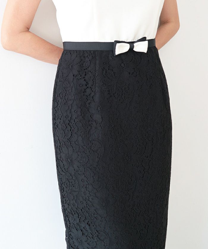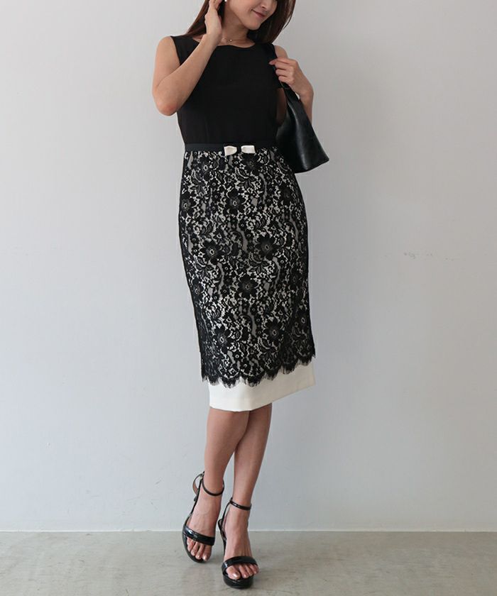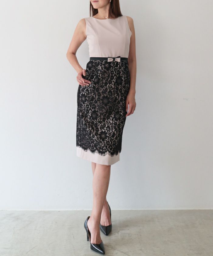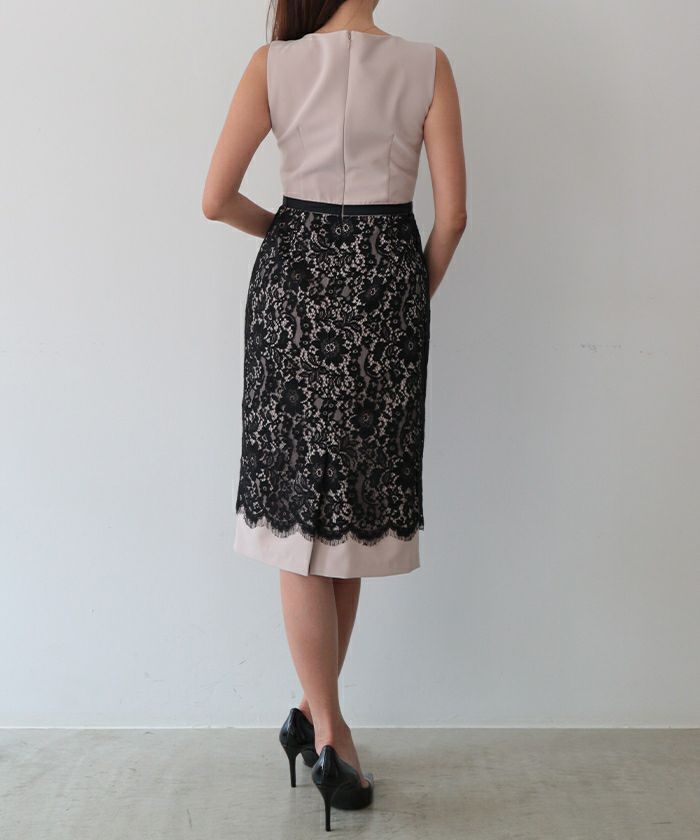 伸縮性に富んだ布帛生地と上品で高貴なコードレースをドッキングさせたノースリーブドレス。