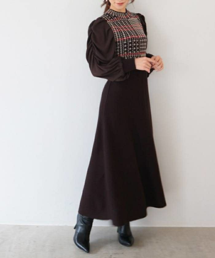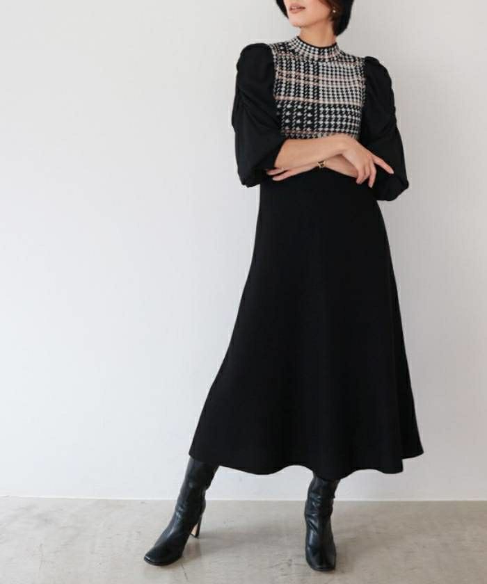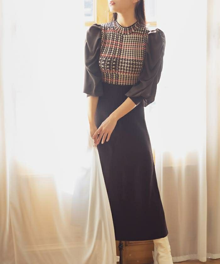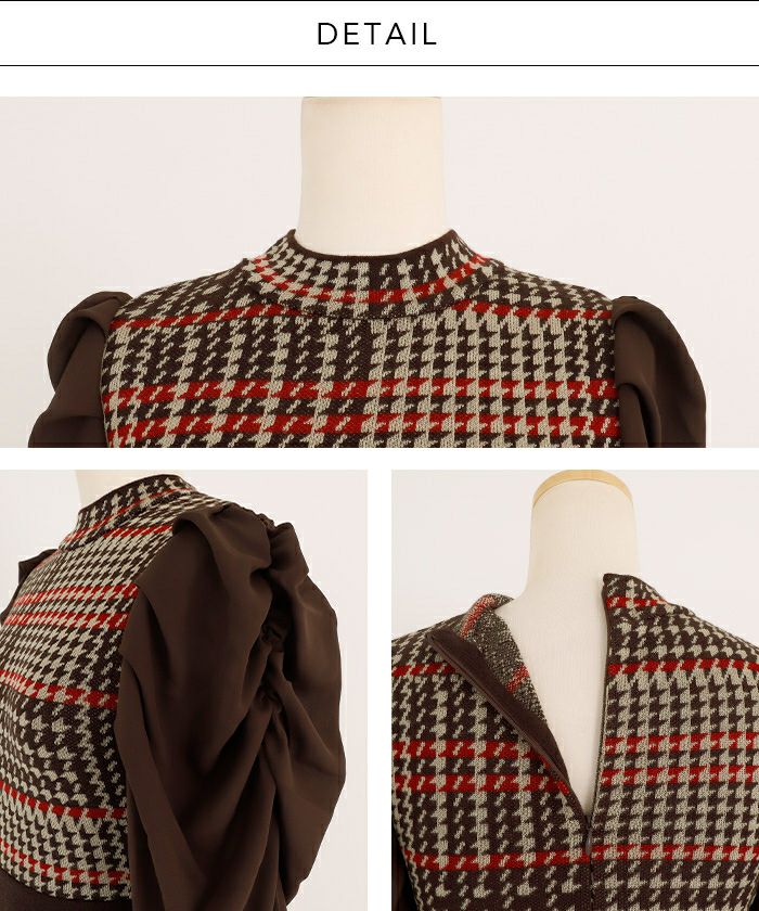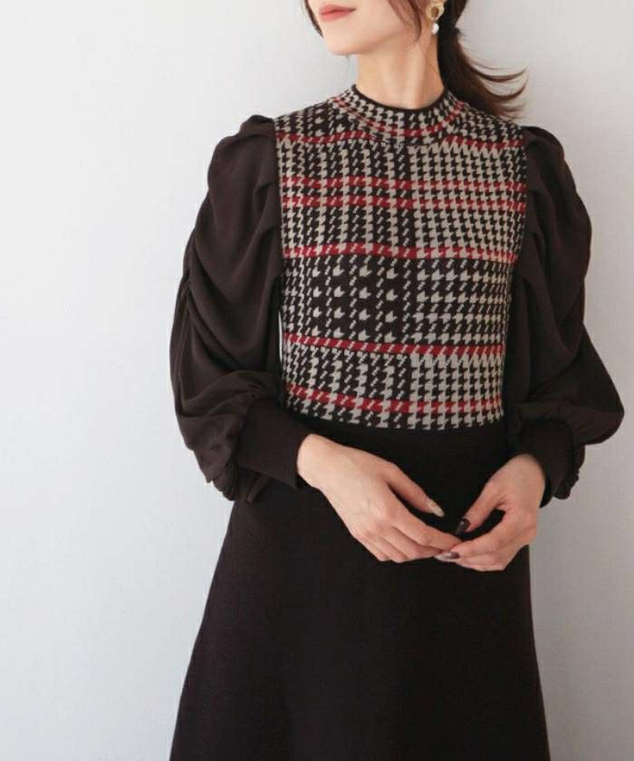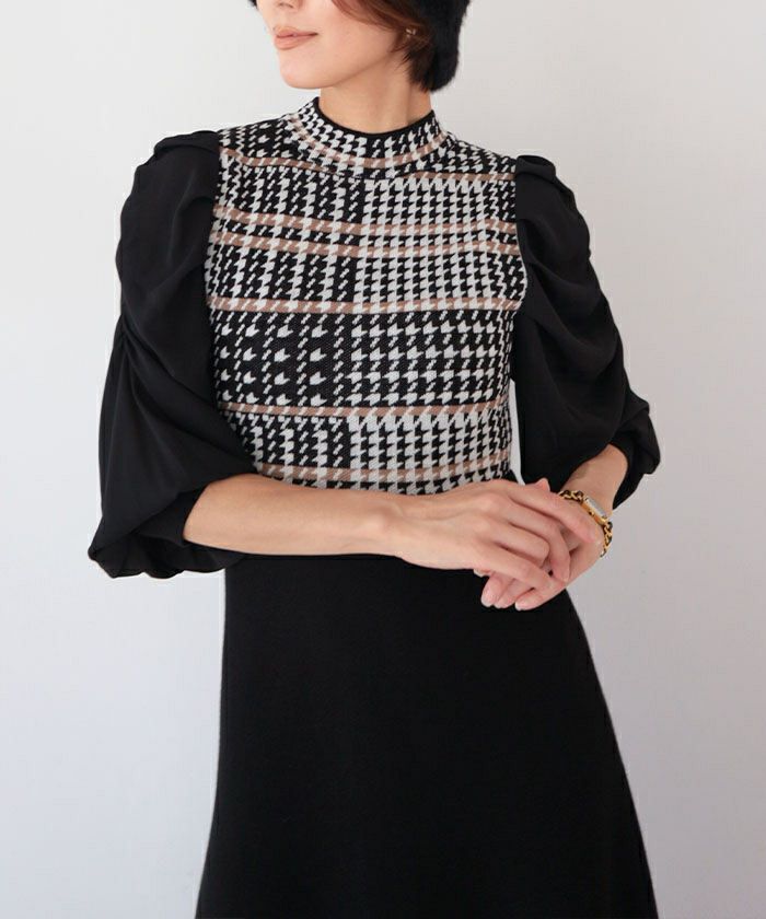 格子柄と無地で切り替えたサラリとした質感のニット地で、一枚でコーデが完成する優れもの。