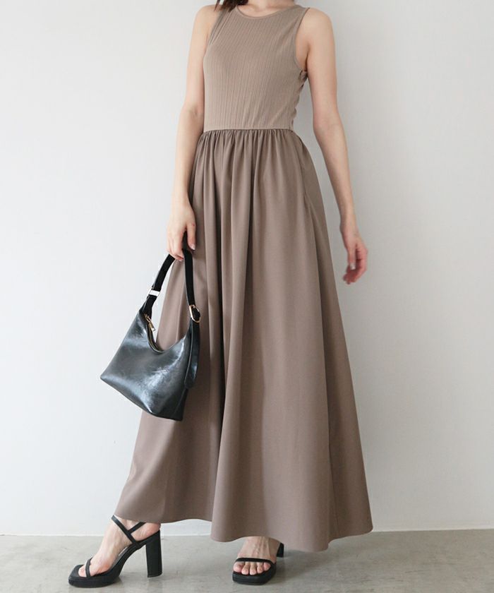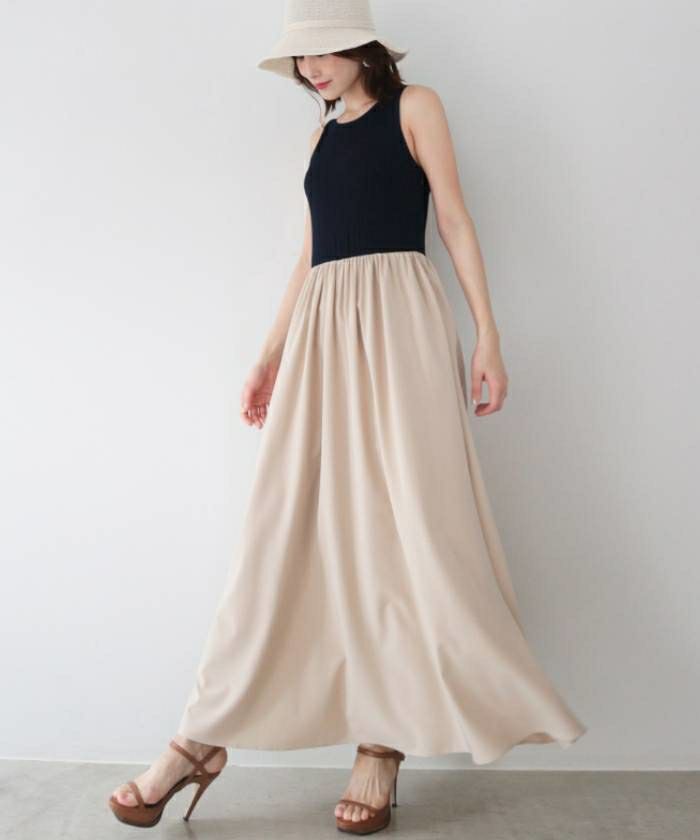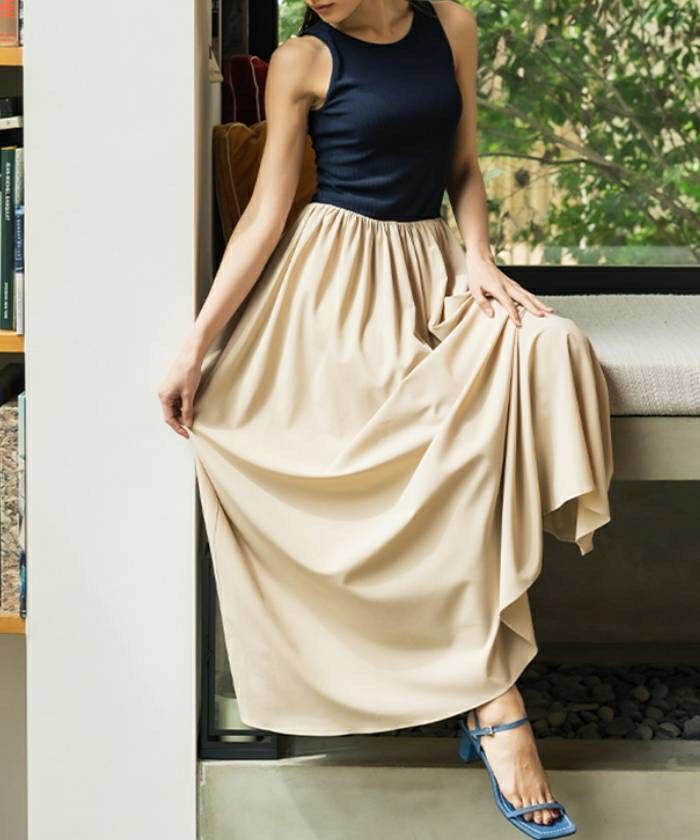 汗ばむ季節に嬉しい、コンパクトなサマーニットに、落ち感のいい生地をふんだんに使ったマキシスカートを組み合わせました。