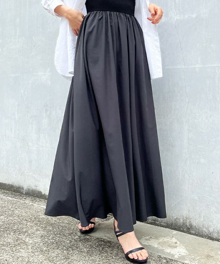 蹴回したっぷりなスカートはサラッと滑らかな素材で、ボリュームを感じさせない仕上がりに。