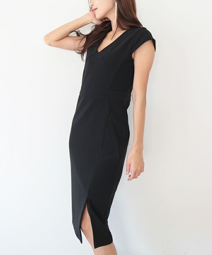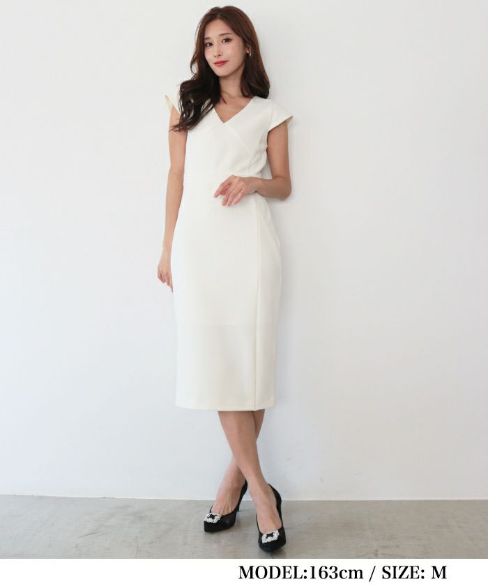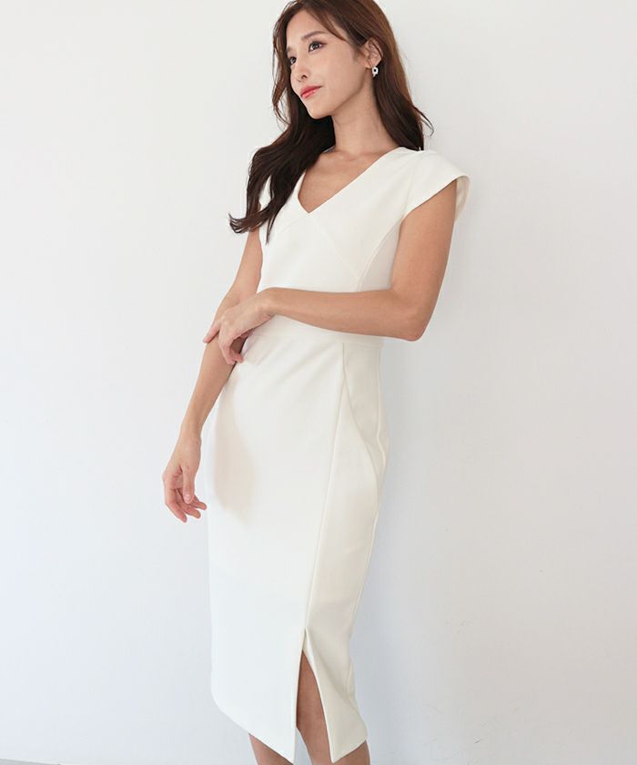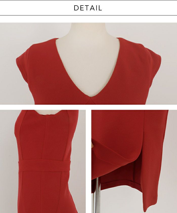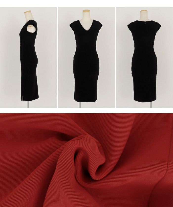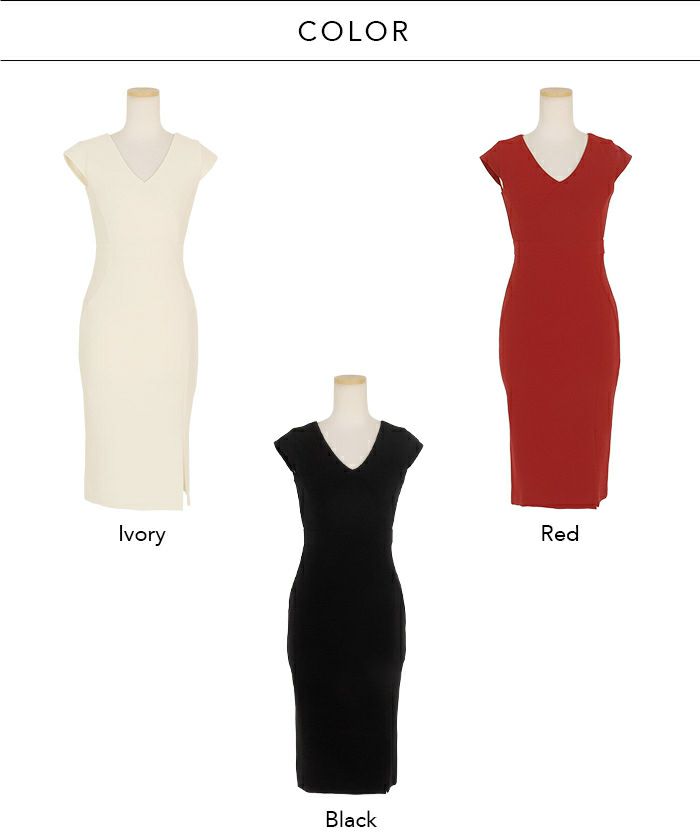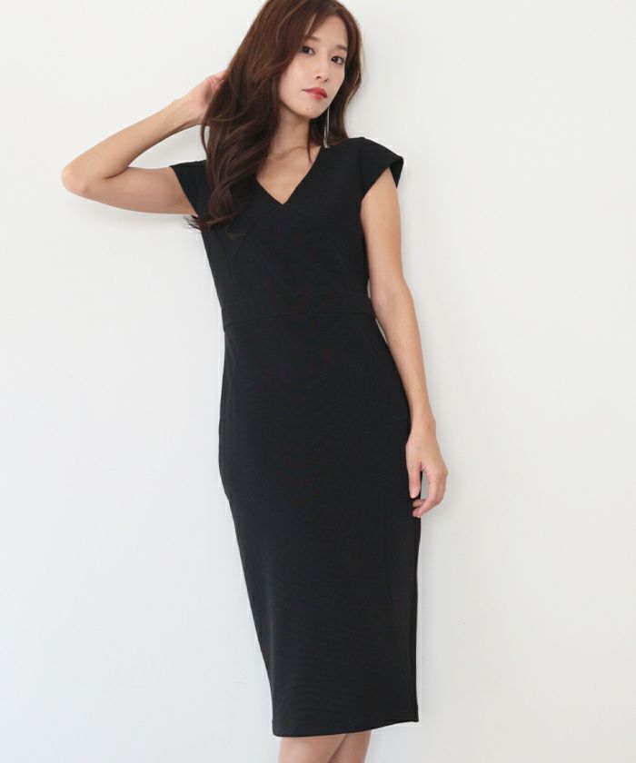 美シルエットを叶えるタイトドレス。ストレッチ素材を使用していながらも、カジュアル感を感じさせず品よく仕上げてくれるのは、巧みなパターン使いが美しいシルエットをつくりだしてくれるから。前後にダーツを施しウエスト周りはスッキリと、裾にはスリットを設けて色香をプラスしました。ざっくりと空いたVネックラインでデコルテを綺麗に見せ、肩先を覆うキャップスリーブ仕様でさり気なく腕周りをカバー。品のいい膝下丈で、程よく肌分量を調節してくれます。深みのレッドを差し色に迎えた3色展開は、一枚ではもちろん羽織物とも好相性。飽きが来ず、シーズンレスに長くご着用いただけるでしょう。