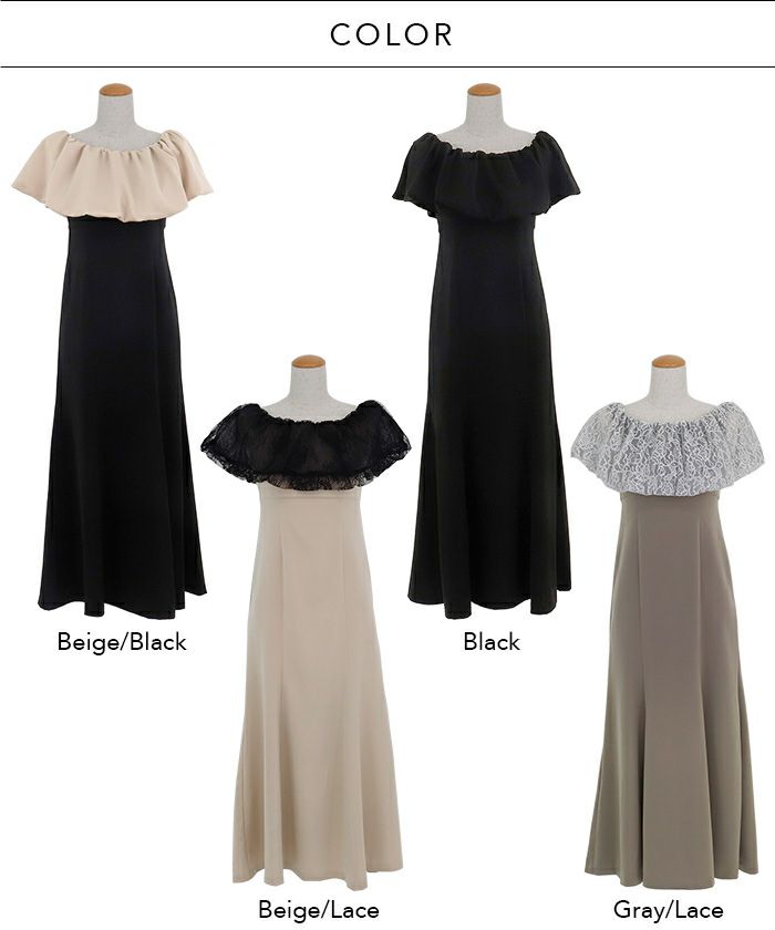 トレンドのバルーンパフディテールをネックに施した美しいドレスは、柄の異なるレース2色とボディ同生地を使用した無地2色で展開。