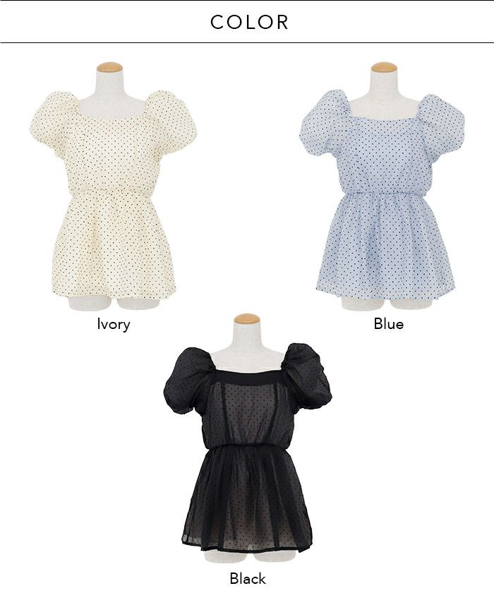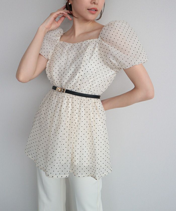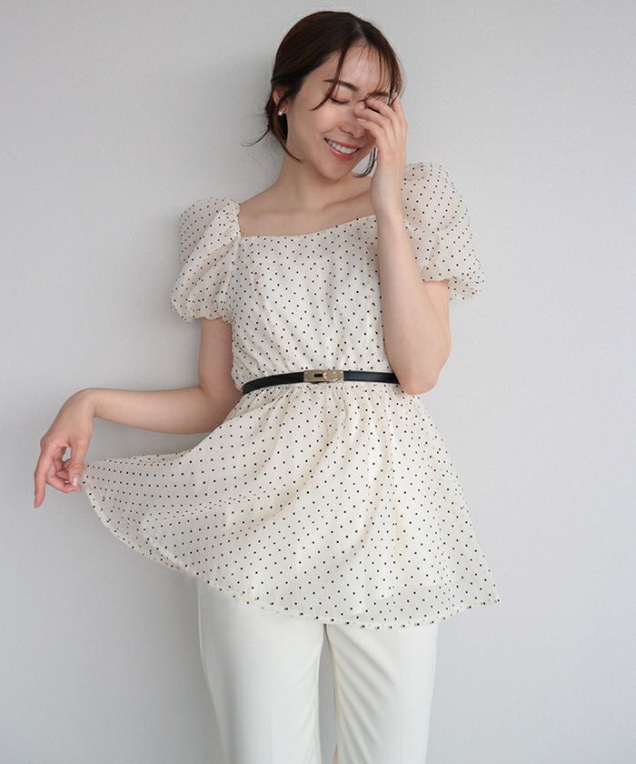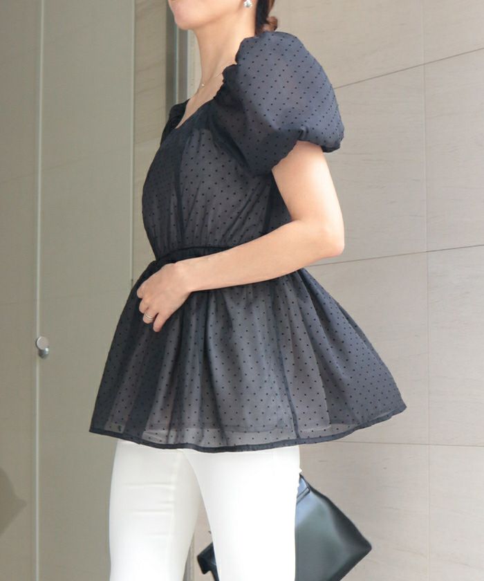 商品情報 ふんわりとしたボリューム袖と細かいフロッキードットがポイントの着映えトップス。