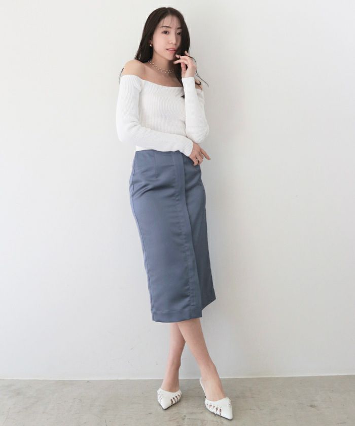 伸びのある上品な艶の生地を採用したシルエット美なスカート。フロントのダブルジップはお好みでスリットの深さを調節することが可能で、比翼仕立てで隠れるように仕上げているのですっきりと上品な印象に。ウエスト周りにゴムを使用していないので無駄なシワが起きずフラットになるので、トップスのイン、アウト問わず綺麗に着用いただけます。合わせやすさとしっとりとした華やぎを叶えたニュアンスカラーを展開しました。