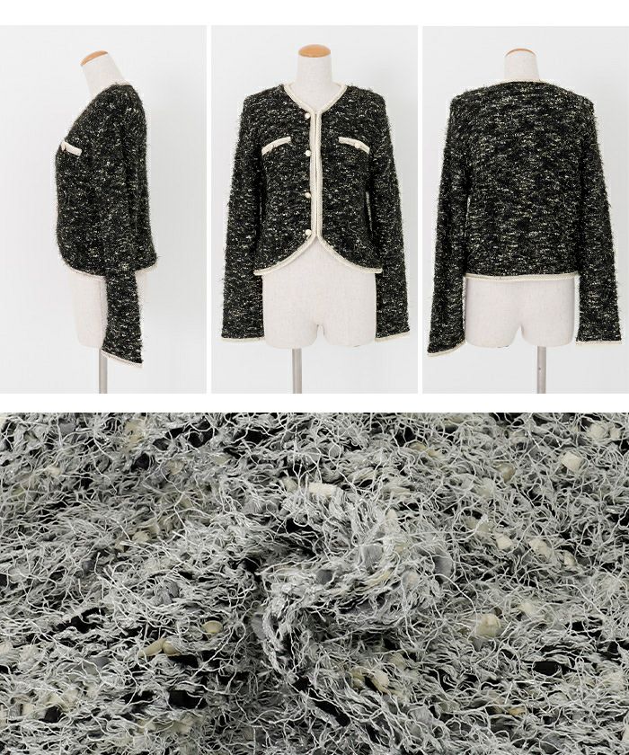 起毛感あるラメや、タッセルリボンフリンジなど様々な糸をミックスさせたカラーツイードのような贅沢な表情がポイント。