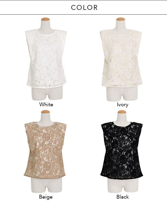 トレンドのショルダーパッド入りトップスを、総レースでフェミニンな表情に仕上げました。