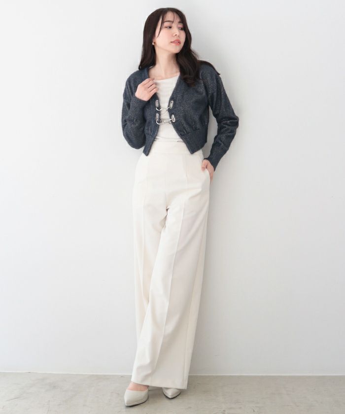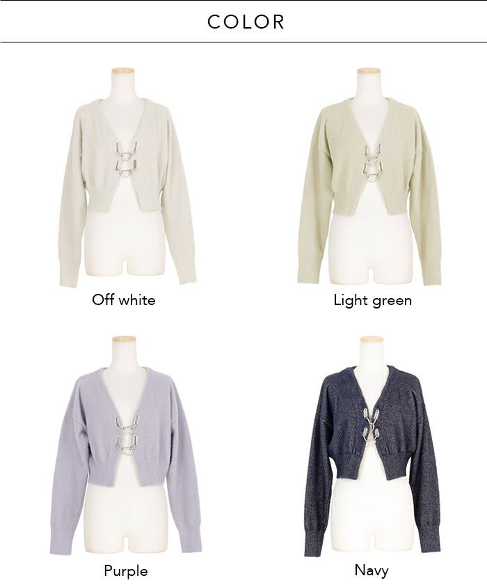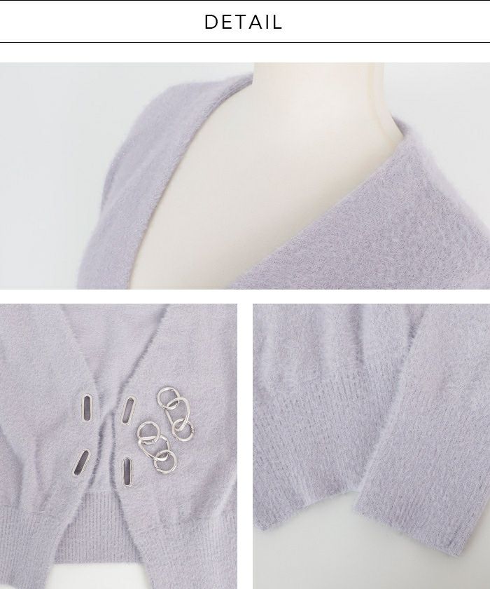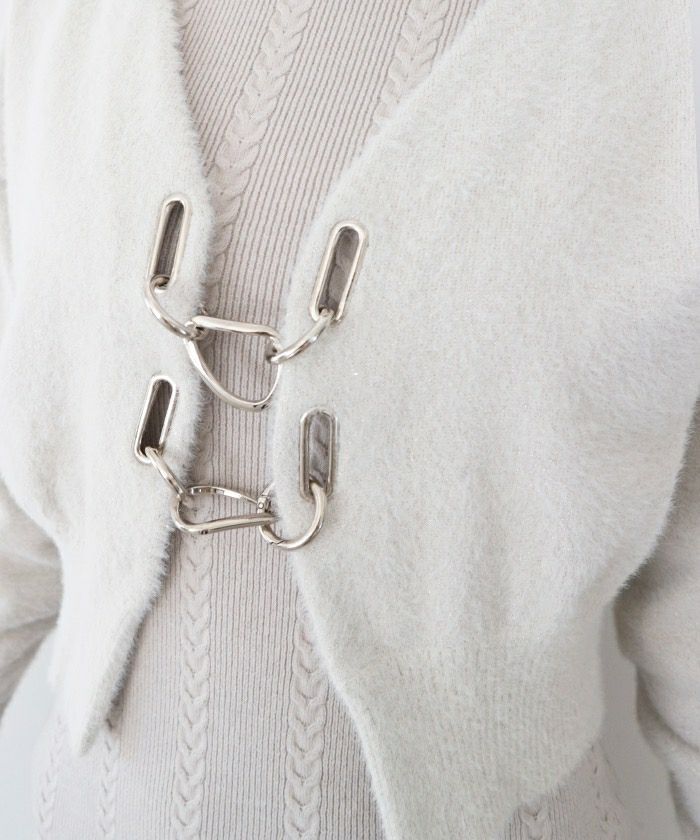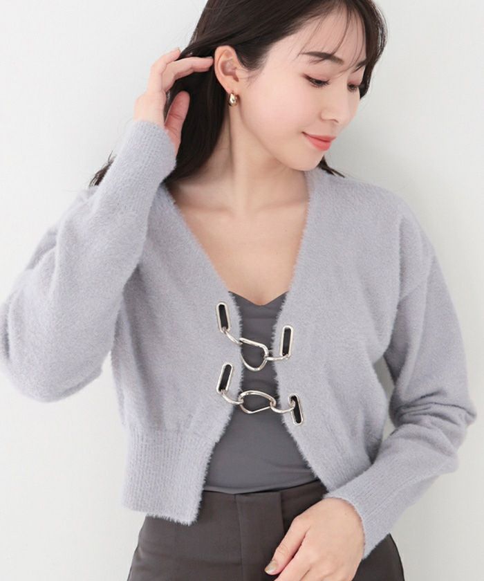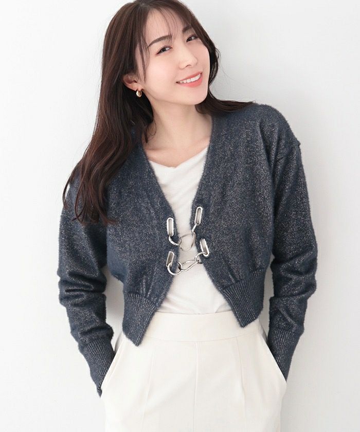 さりげなく煌めくラメと主張しすぎないシャギー糸がふわりと心地よいニットカーディガン。厚すぎず、軽すぎず、冬から春、秋口などの端境期にさらっと羽織るにもぴったりです。深めに開いたプランジネックに、開閉ができるフロントのパーツがポイント。メタリックなシルバートーンのリングパーツは着こなしにシャープな存在感を与えます。ボディと袖は程よくゆったり、袖先と裾のリブで締まるシルエット。ウエスト位置にかかるショート丈でバランスよく合わせられます。