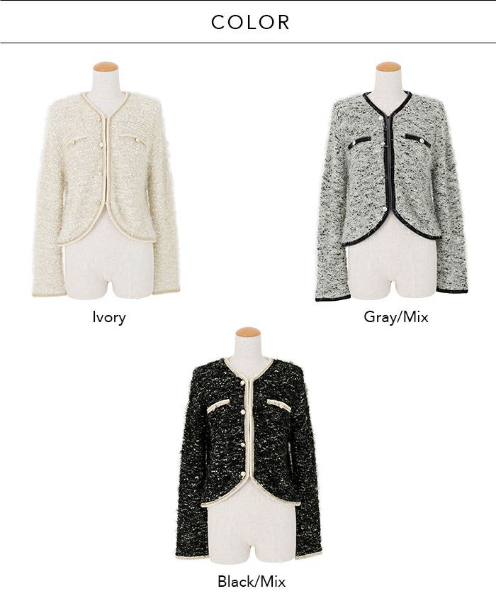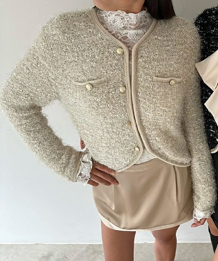 纏うだけで華やかな毛足あるシャギー素材が魅力の、ジャケットライクなニットカーディガン。