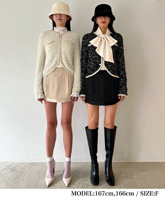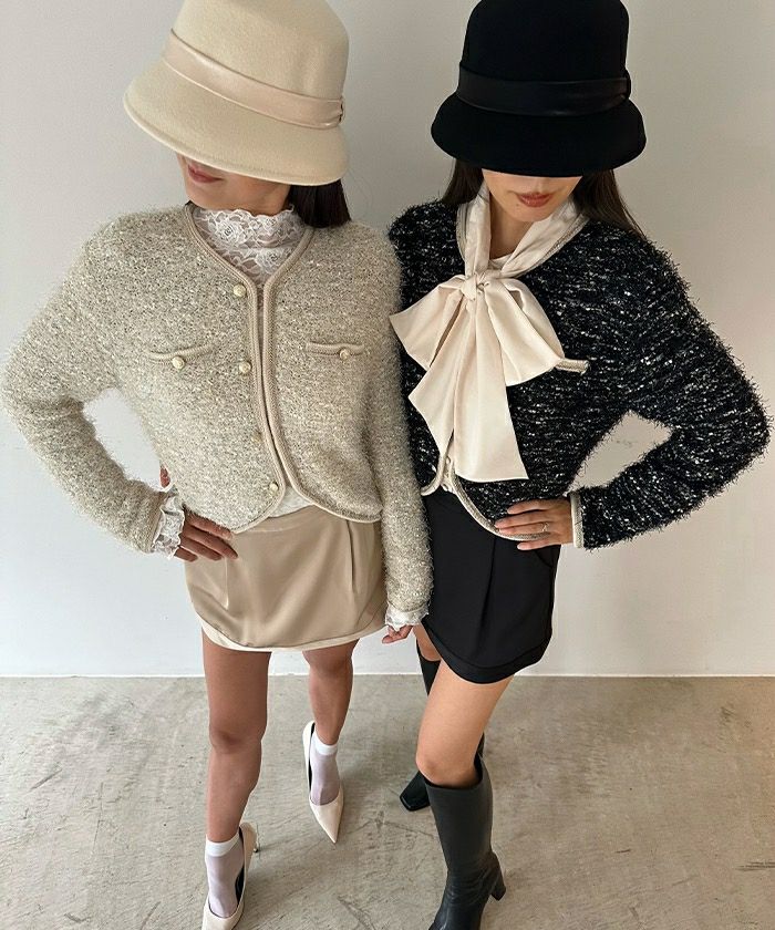 起毛感あるラメや、タッセルリボンフリンジなど様々な糸をミックスさせたカラーツイードのような贅沢な表情がポイント。