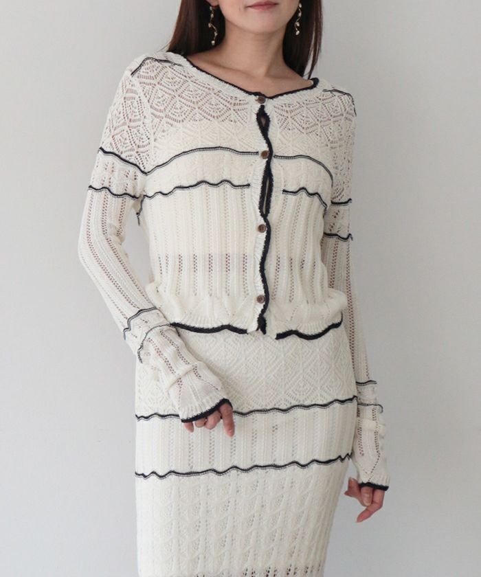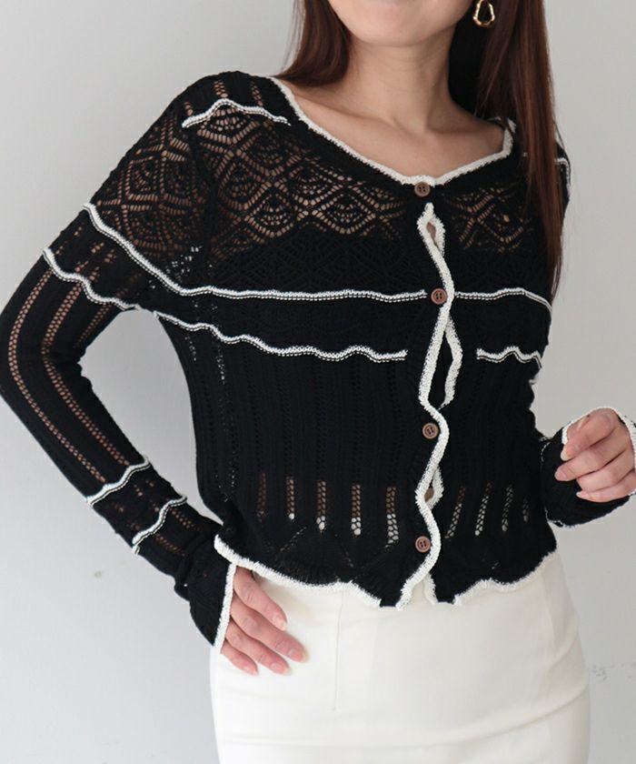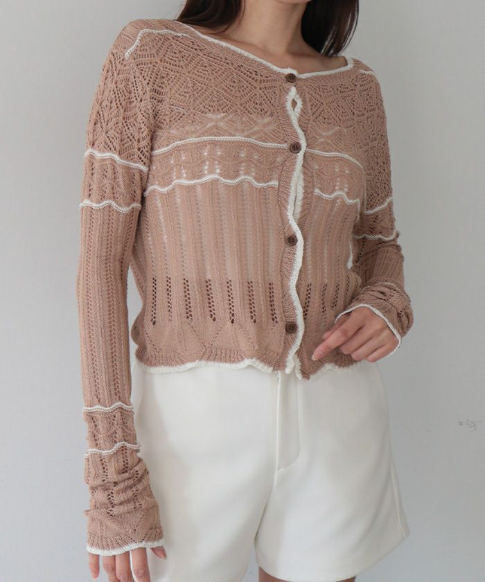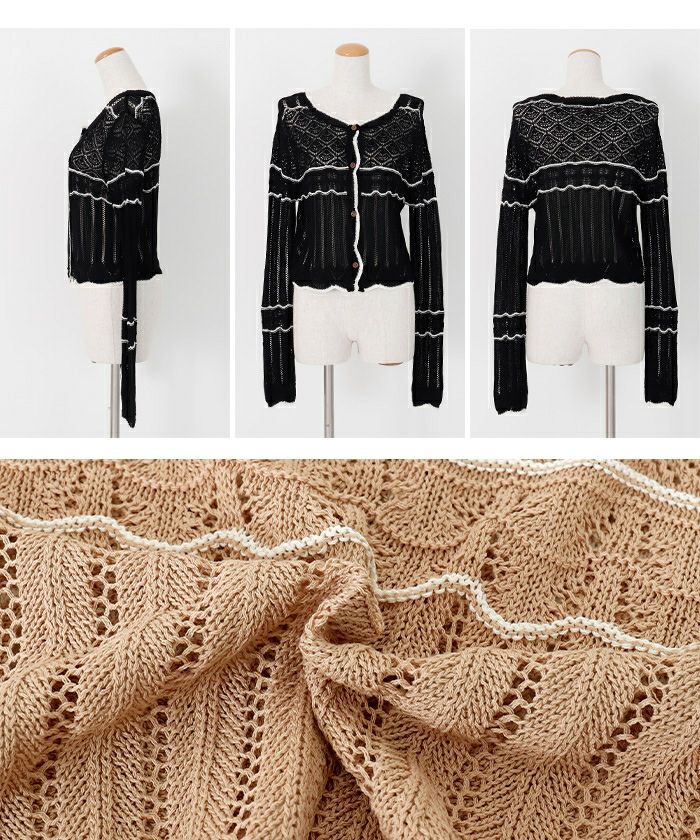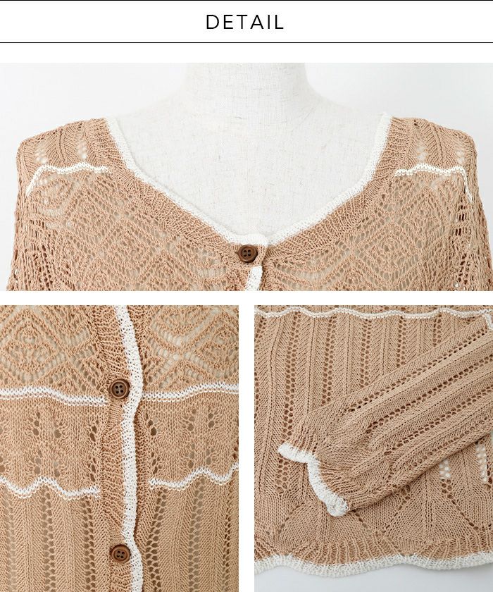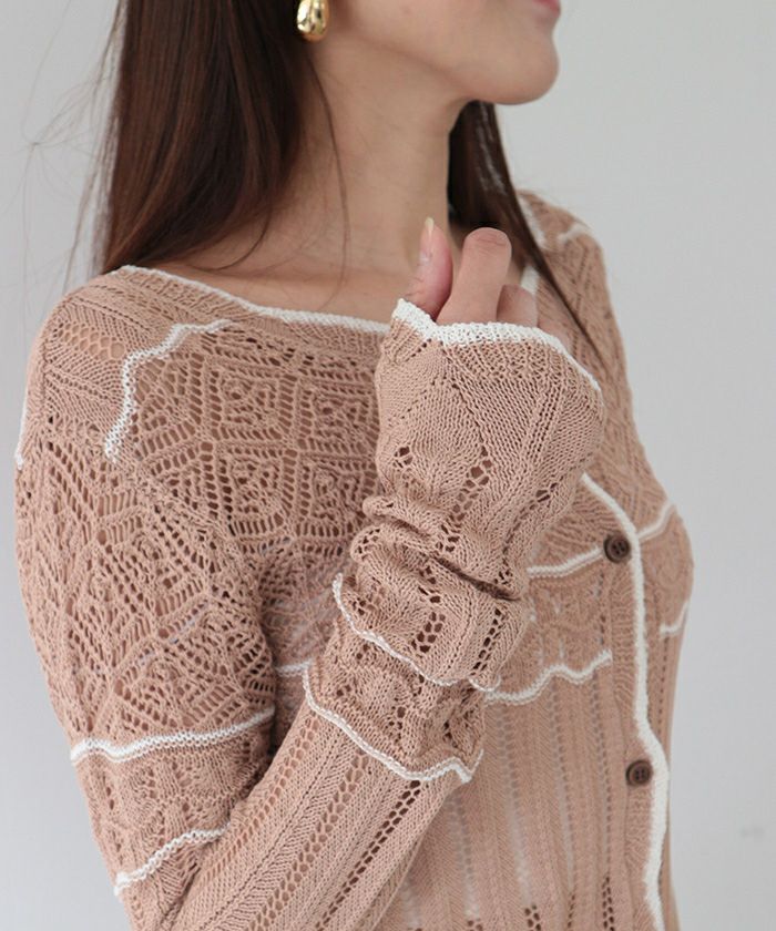 ナチュラルな風合いと細やかな4種の透かし柄がマッチした、優雅で美しいクロシェニットシリーズのロングスリーブカーディガン。