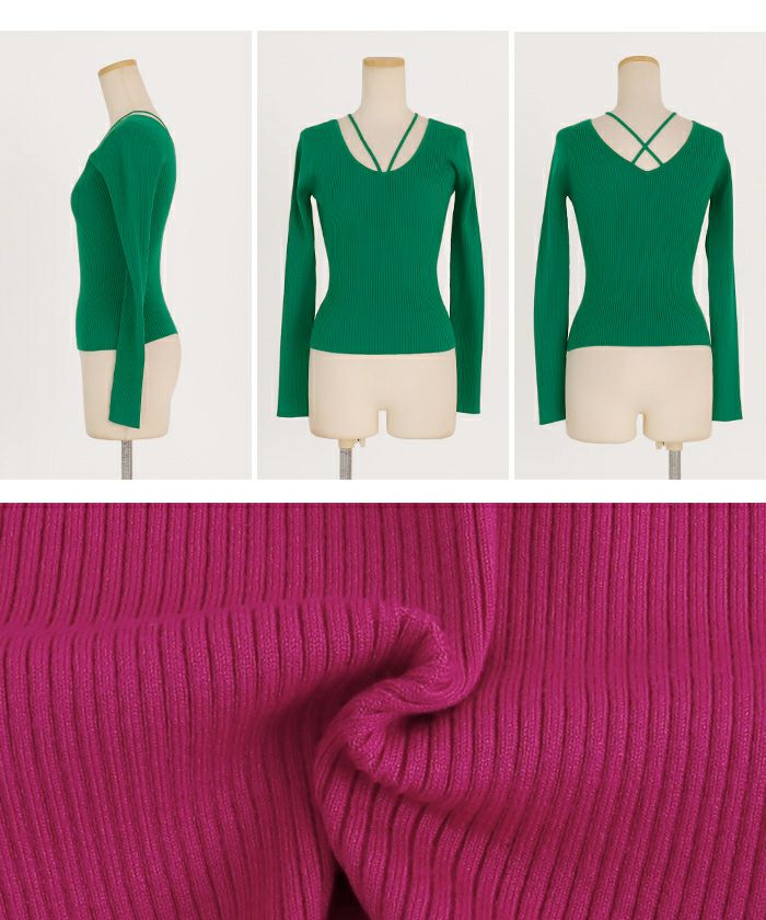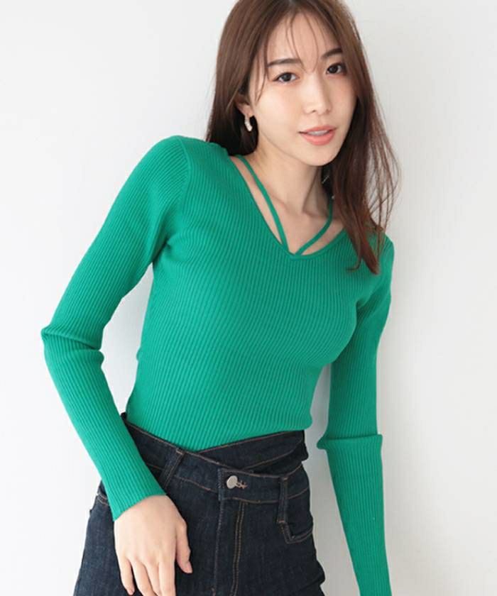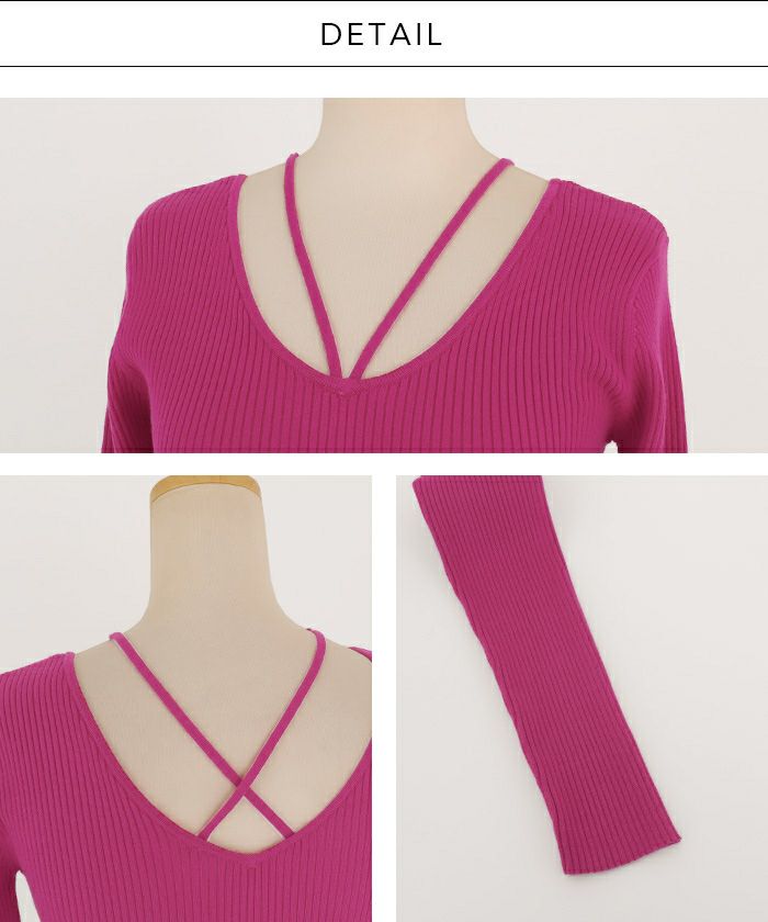 深めに開いたVネックでデコルテを綺麗に見せ、2本の華奢なホルターラインで高感度に仕上げました。