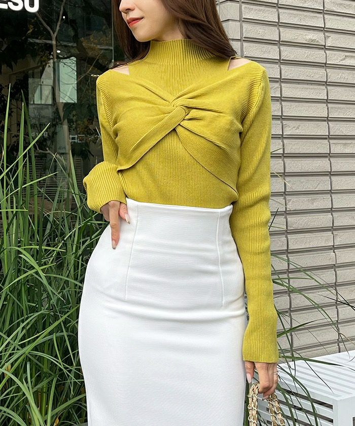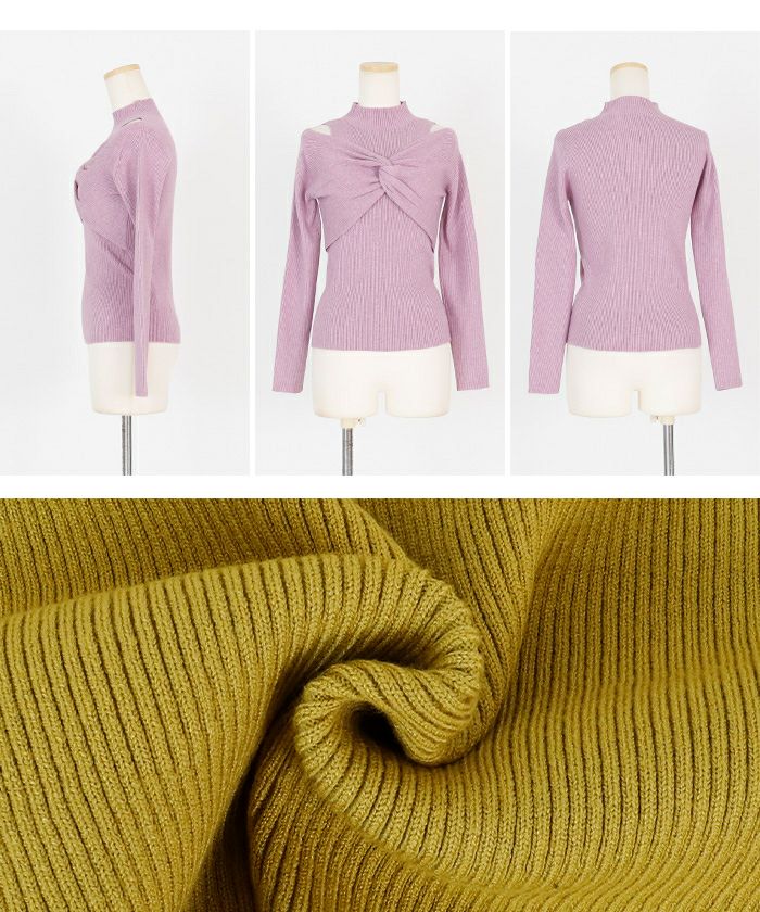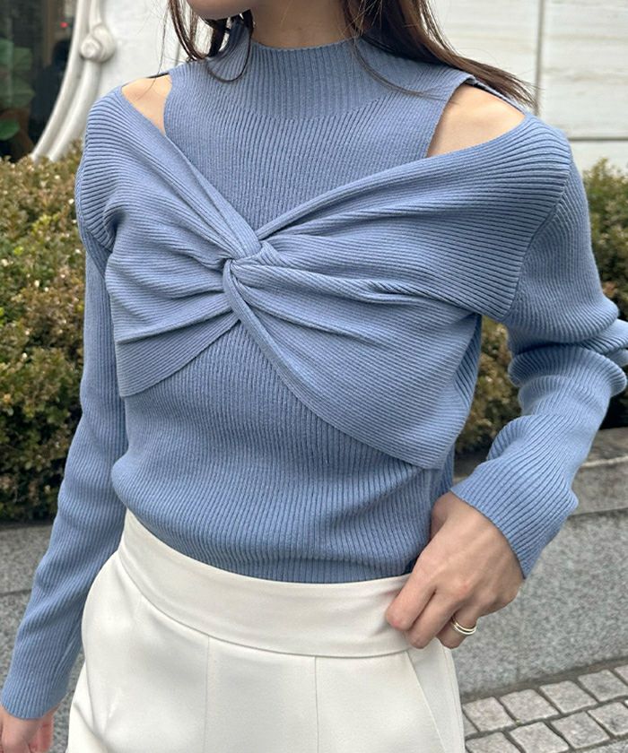 AMBIENTで人気のボトルネックに、フロントツイストのニットをレイヤードした、今までにないデザインが魅力的な一枚。